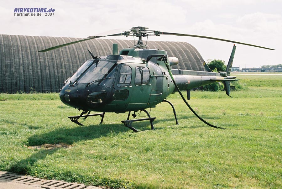Die Dänischen Luftstreitkräfte waren mit zwei Hubschraubern vom Typ Aérospatiale ( jetzt Eurocopter ) AS 550 Fennec im Static Display der Belgian Helidays 2007 vertreten. Dieser Fennec hier wurde zum Absetzen von Spezialeinheiten mit zwei dicken Tauen ausgestattet, an denen sich die Soldaten bei einem Einsatz im "fast roping"-Verfahren abseilen können.