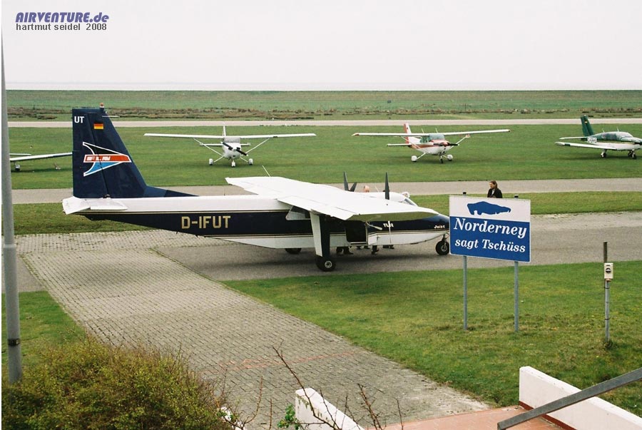 Die Firma Luftverkehr Friesland Harle hat alle Hände voll zu tun : Beim Besuch von AirVenture-Mann Hartmut Seidel im April 2008 waren zum Beispiel zwei der drei LFH Britten-Norman Islander im normalen Liniendienst zu den Nordseeinseln im Einsatz, mit dem dritten Islander wurden an diesem Tag gerade einige der bereits erwähnten Offshore-Beobachtungsflüge durchgeführt, wobei die Maschine insgesamt 14 Stunden in der Luft gewesen ist ! Aus diesem Grunde musste für die an diesem Tag von der DEL ( = Die Event Luftreederei ) mit der LFH organisierte Nordseeinsel-Sonderflugaktion für eine Gruppe von 9 Personen ein Britten-Norman Islander der Fluggesellschaft Frisia-Luftverkehr Norddeich ( = FLN ) eingesetzt werden. |