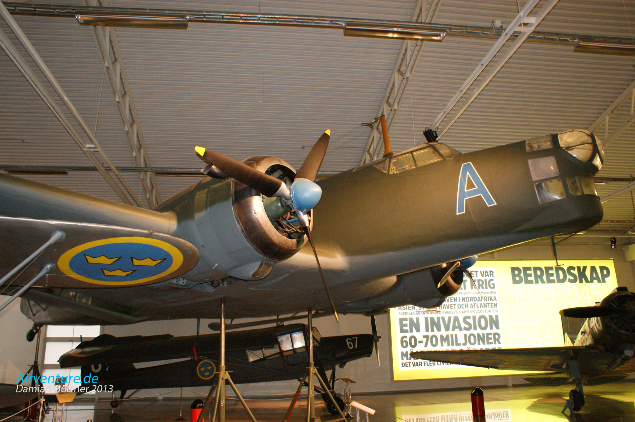 Das Wrack der Douglas DC 3 in der "Kellerausstellung". Diese Maschine ist Bj. 1942, wurde am 27. Januar 1943 an die US Air Force ausgeliefert, im Mai kam sie zur 9. Air Force nach Nordafrika. Diese Maschine war dann am D-Day dabei, am 5 Februar 1946 kam sie nach Schweden, aber erst zwei Jahre später zur F 1 Squadron (nach der Umbenennung 1950 zum F 8 Squadron) der schwedischen Luftwaffe. Fast die ganze Zeit war die Maschine in Bromma stationiert und zur Schulung der Bordfunker eingesetzt. Am 13. Juni 1952 startete die DC 3 zu einem Routineschulungsflug, bei der Insel Gotland hat sich der Pilot dann etwas "verfranzt" und die Maschine geriet ins sowjetische Hoheitsgebiet. Daraufhin wurden sie von zwei MiG 15 abgefangen und abgeschossen, alle Besatzungsmitglieder starben.