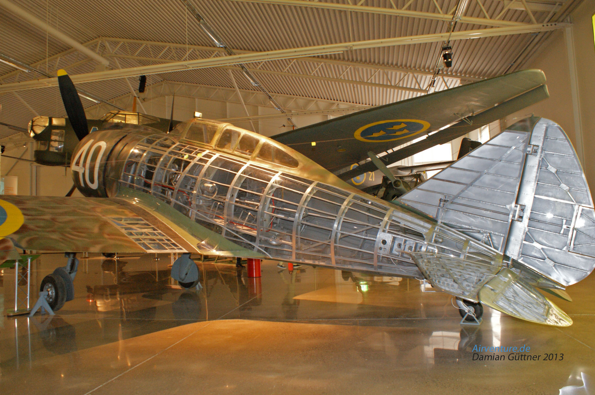 Eine seltene und nur eine von zwei Existierenden Regiane Re 2000 Falco. Als das Flugzeug am 14. August 1942 in Schweden angekommen ist, bekam es die Bezeichnung J 20, BauNr. 2340. Zugeteilt wurde die Regiane dem F 10 Squadron und diente dort bis zum 20. Juli 1945. Danach waren die Flugstunden erreicht und man entschloss sich, es nicht zu verschrotten sondern einer Ausbildungseinheit zu schenken. Dort wurde die linke Seite für Ausbildungszwecke geöffnet.